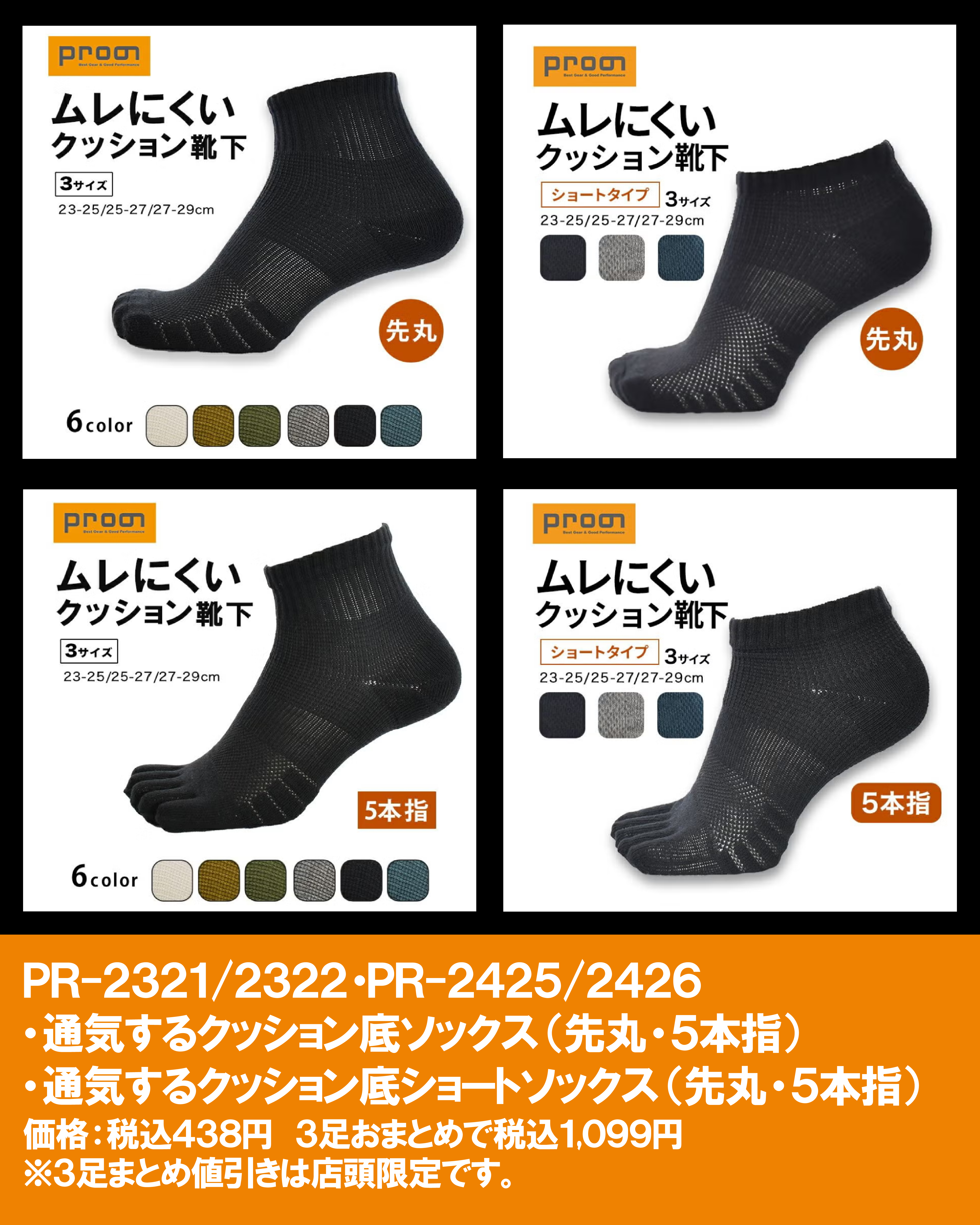 ・PR-2425/2426 通気するクッション底ショートソックス(先丸・5本指)
